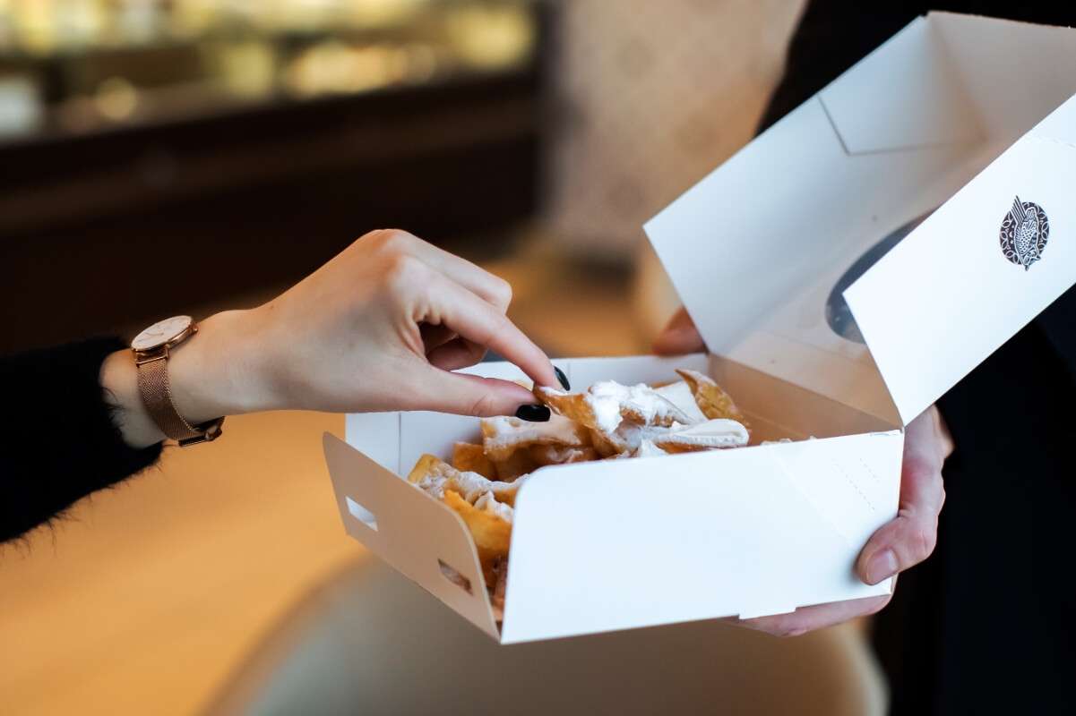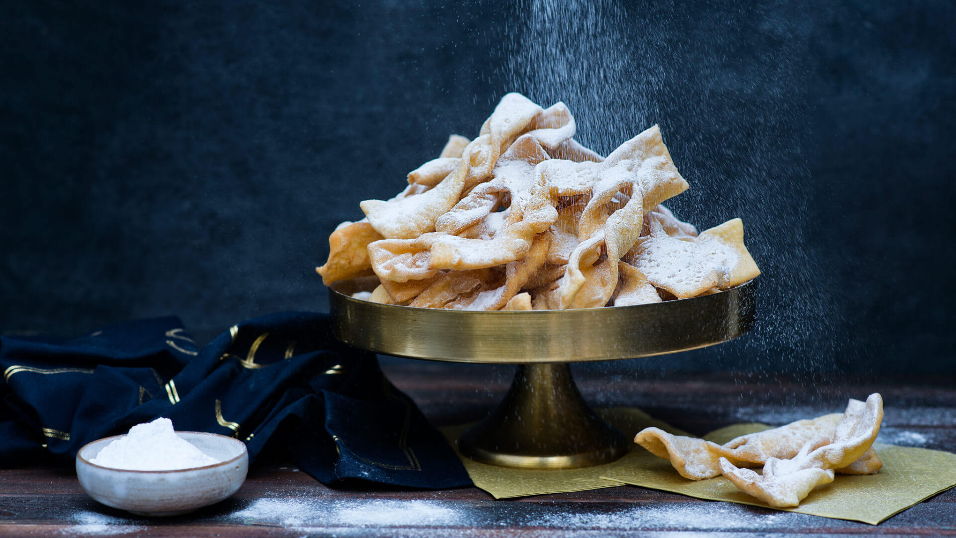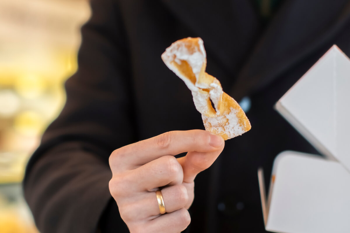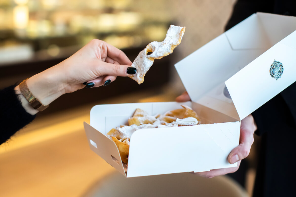 Faworki z kruchego ciasta posypane cukrem pudrem.