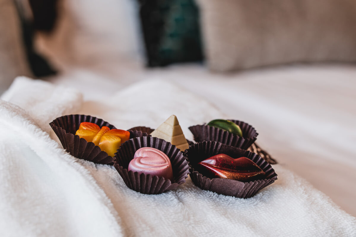 Zestaw wyselekcjonowanych pralin i trufli Cukierni Sowa w eleganckiej białej skrzynce.