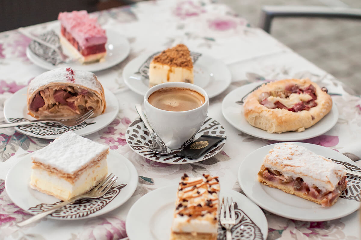 Ciasto francuskie przełożone kremem budyniowym i musem śmietanowym, wykończone cukrem pudrem.