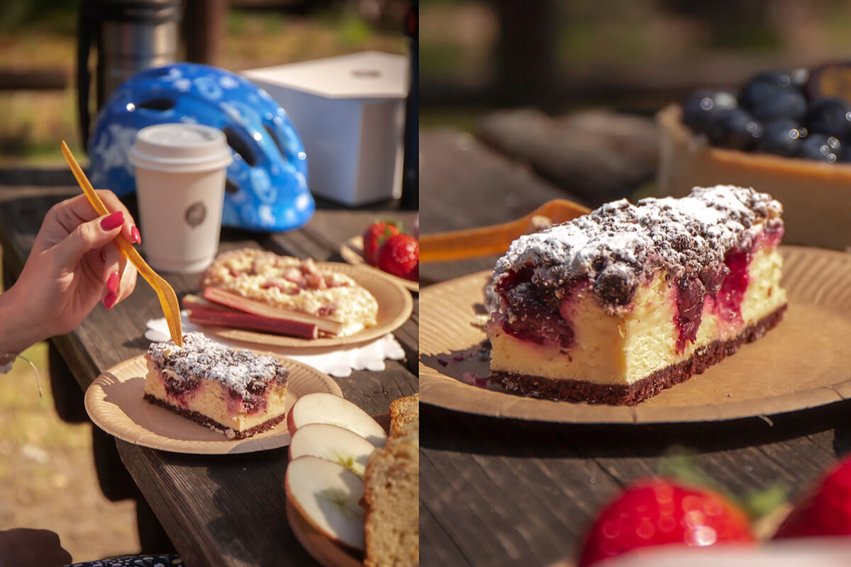 Ciasto o smaku kakaowym w połączeniu z masą serową i wiśniami w żelu, wykończony kruszonką kakaową i cukrem pudrem.