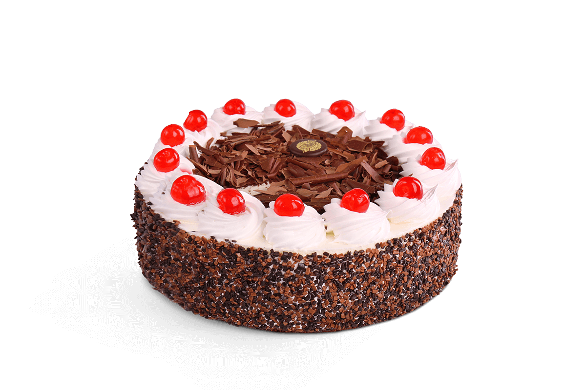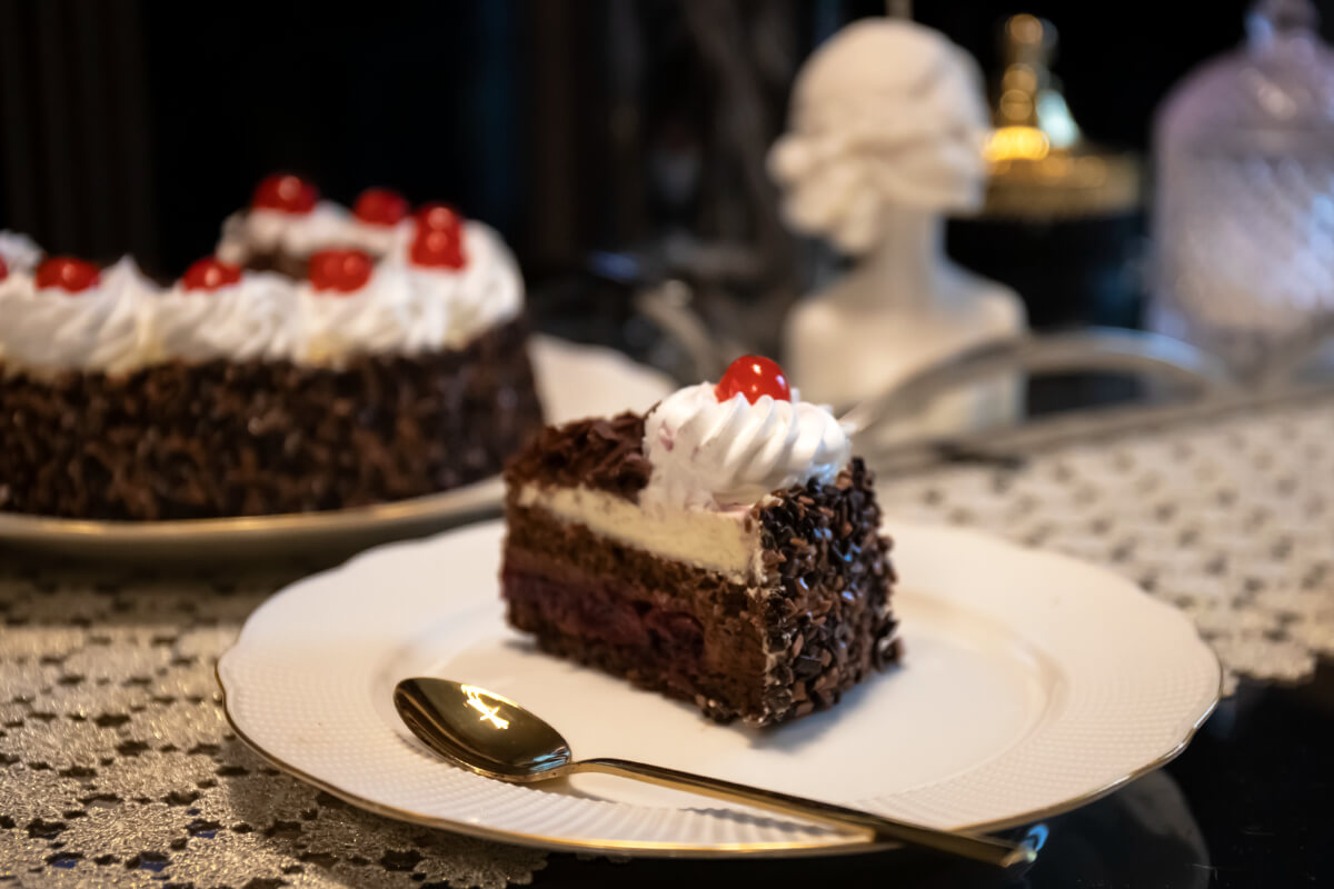 Biszkopty o smaku czekoladowym i kakaowym z wiśniami w żelu i musami: kakaowo-rumowym i śmietankowym z serkiem mascarpone.
