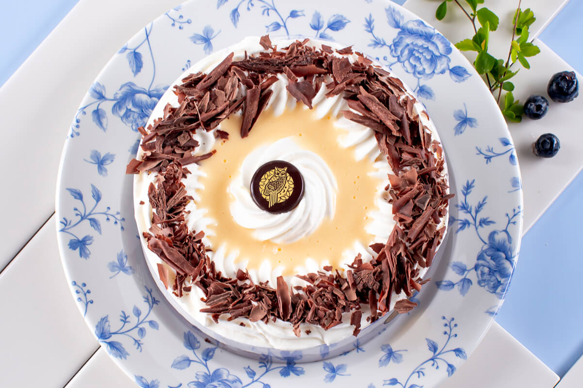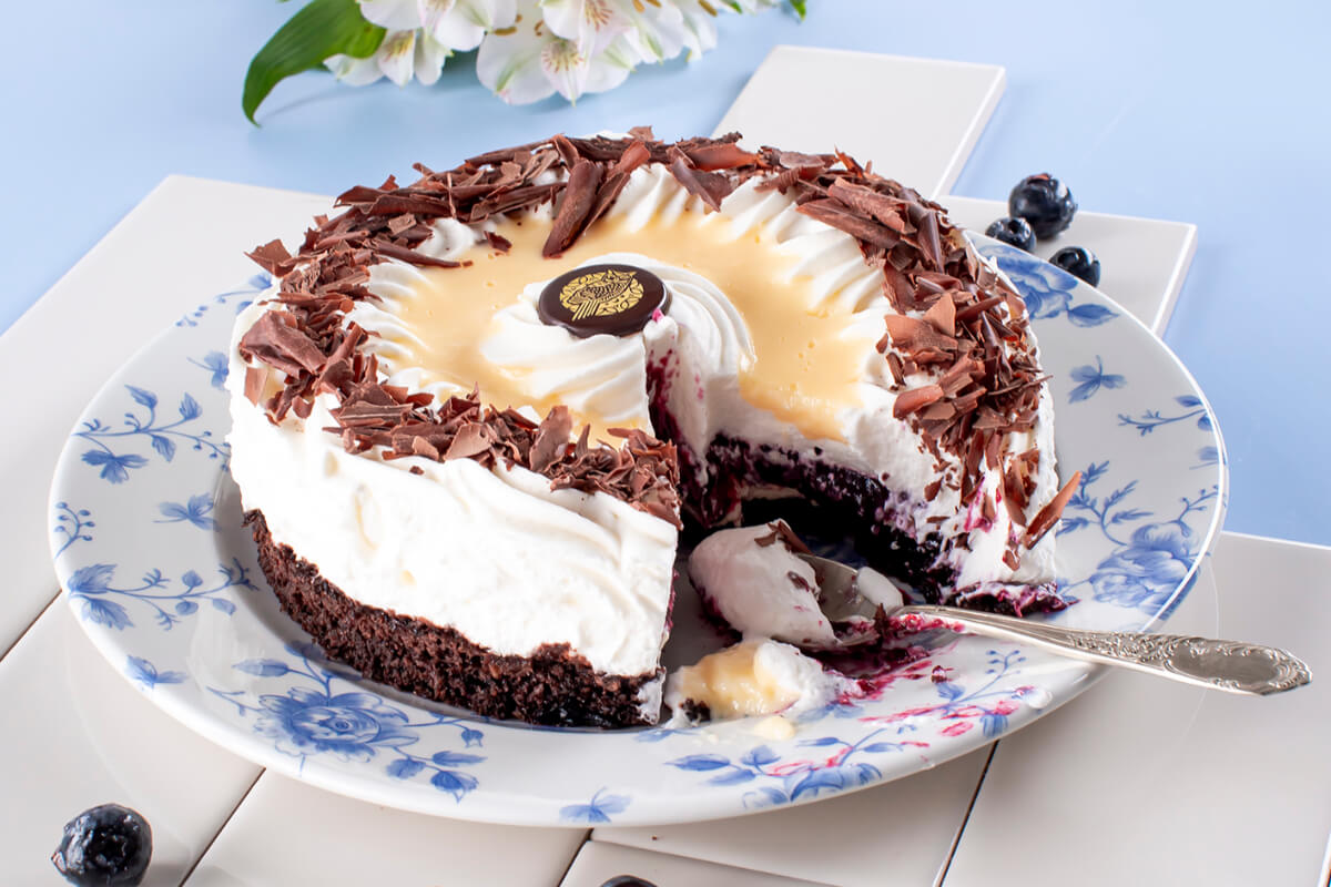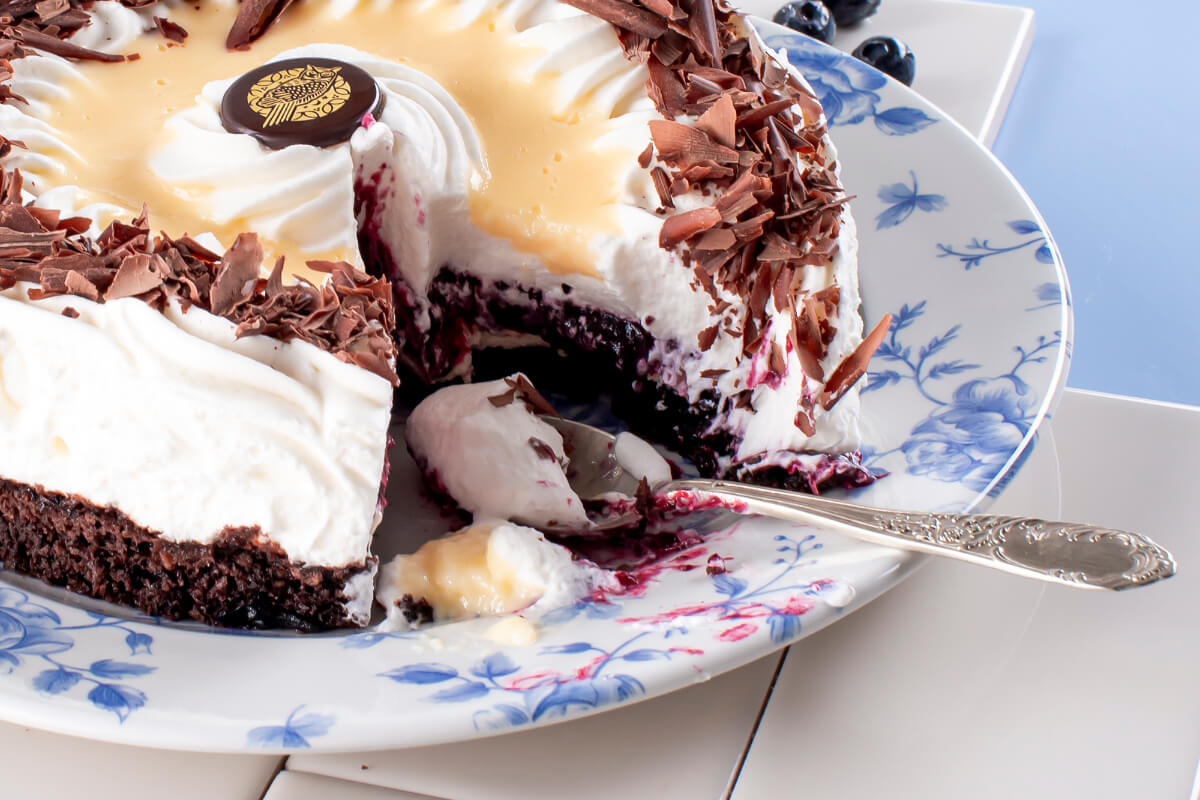 Biszkopt o smaku kakaowym przełożony nadzieniem z czarnej porzeczki, kremem rumowym, musem śmietanowym i adwokatem.