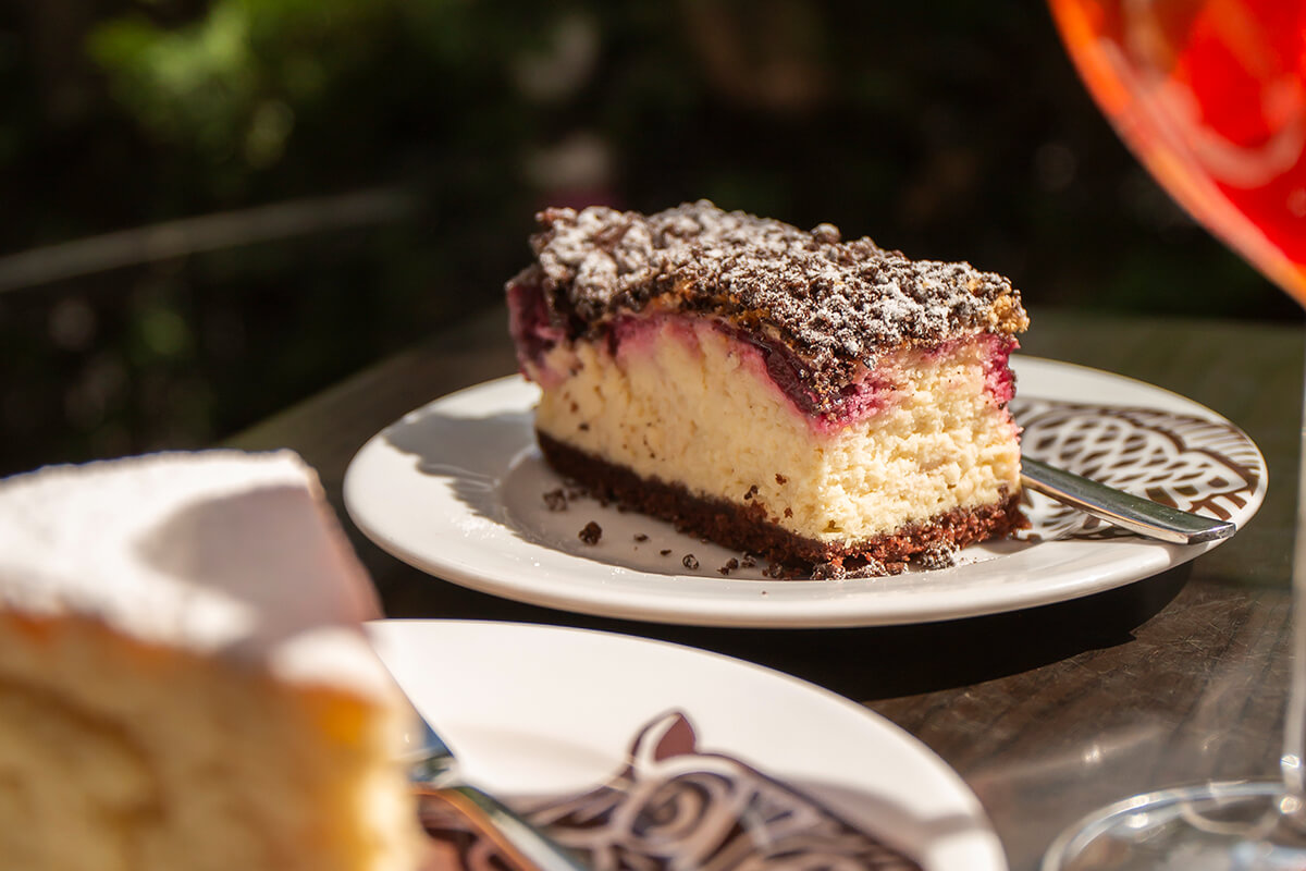 Ciasto o smaku kakaowym w połączeniu z masą serową i wiśniami w żelu, wykończony kruszonką kakaową i cukrem pudrem.
